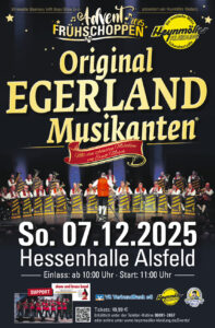 Schwalmstadt-Treysa, eines der größten Modehäuser Nordhessens, am Sonntag, den 7. Dezember 2025, zum großen Egerländer Advent-Frühschoppen in die festlich geschmückte Hessenhalle Alsfeld ein. Zwei hochkarätige Formationen sorgen für ein musikalisches Erlebnis, das Tradition und Moderne vereint – ein Highlight für Musikfreunde jeden Alters.